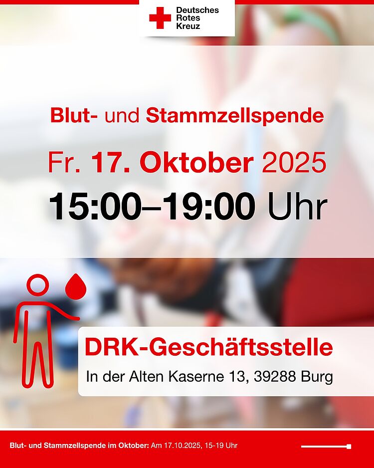 Am Freitag, 17. Oktober 2025, findet in der DRK-Geschäftsstelle Burg, Alte Kaserne 13, von 15 bis 19 Uhr eine große Blutspendeaktion des DRK-Blutspendedienstes NSTOB statt.