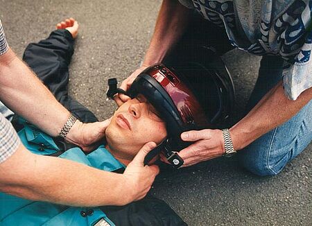 Da es verschiedene Helmtypen gibt, müssen die nachfolgenden Maßnahmen evtl. entsprechend dem Helmtyp abgewandelt werden. Dieses Verfahren des Helmabnehmens soll u. a. verhindern, dass bei Vorliegen einer Halswirbelverletzung versehentlich eine Verschlimmerung der Unfallfolgen eintritt. Die Helmabnahme sollten Sie, wenn möglich, zu zweit vornehmen.